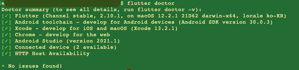 그리고 마지막으로 flutter doctor를 다시 실행해보시면 [v]가 다 되어 있을 것입니다.