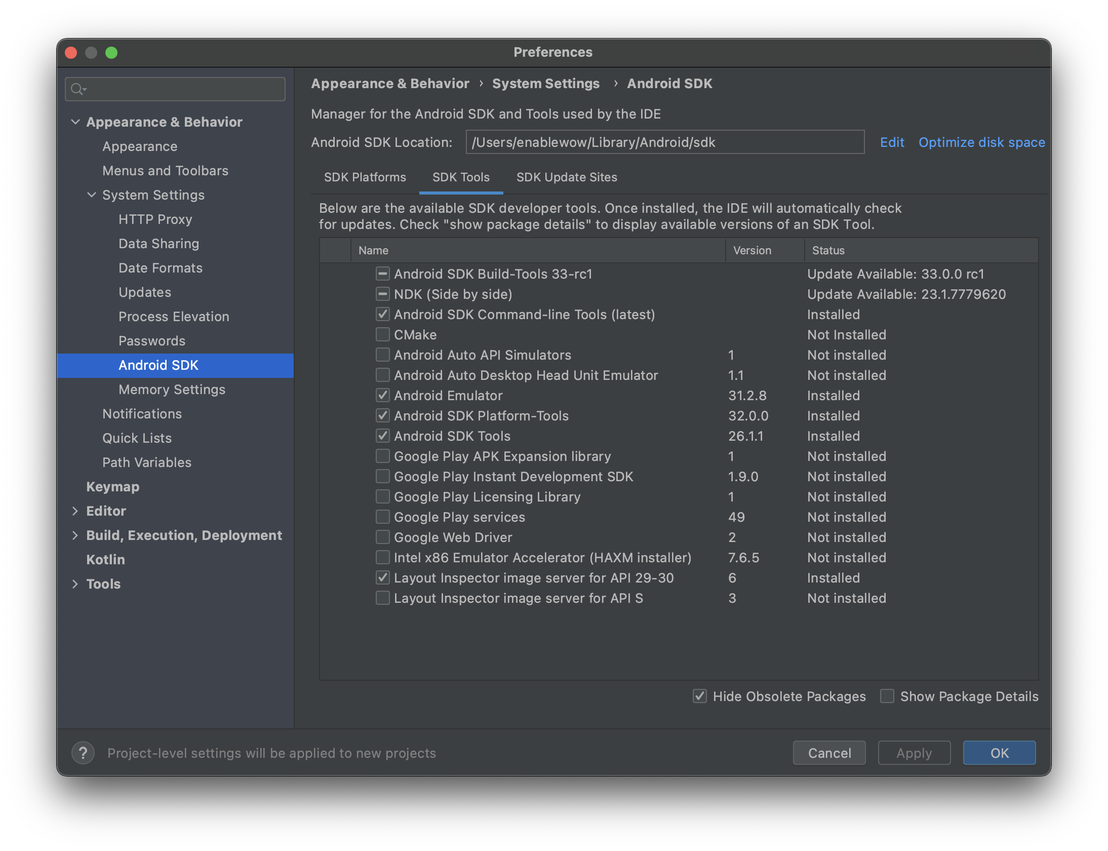 1번 이슈는 android studio에서 Android SDK에서 SDK Tools 에서 Android SDK Command-line tools (latest)를 체크하시고